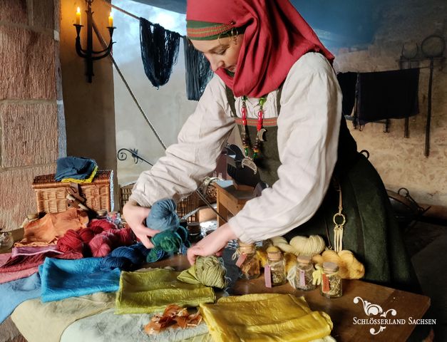 Die Färbemeisterin wird euch in der Schlossküche zeigen, mit welch leuchtenden Naturfarben sie Wolle und Seide versieht. Gleich nebenan könnt ihr aus Blüten und anderen Pflanzenteilen eure eigene Farbe herstellen und mit dem Pinsel Bilder malen. In der Kleiderkammer erfahrt ihr, dass früher nicht jeder einfach mit seiner Lieblingsfarbe herumlaufen konnte und könnt euer eigenes Wappen gestalten. Natürlich in den richtigen Farben!